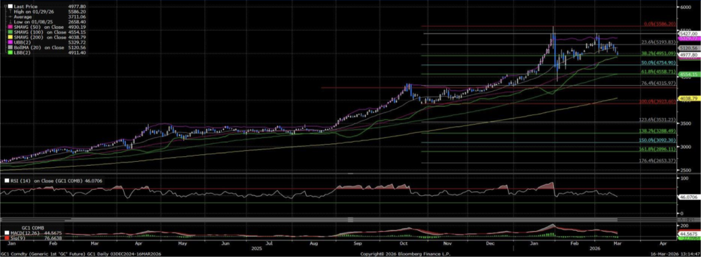 Öte yandan yükselen petrol fiyatlarının enflasyon baskısını güçlendirmesi nedeniyle ABD Merkez Bankası ve diğer büyük merkez bankalarının faiz indirimi beklentilerinin zayıflaması faiz getirisi olmayan altın için sınırlayıcı bir unsur olarak öne çıkıyor. Teknik olarak ons altın, güçlü yükseliş trendi sonrası 5.300-5.500 dolar direnç bölgesinden gelen satışlarla yatay-düzeltme sürecine girmiş görünüyor ve fiyat güncel olarak yaklaşık 4.970 dolar civarında ana hareketi ortalamaların üzerinde tutunuyor.