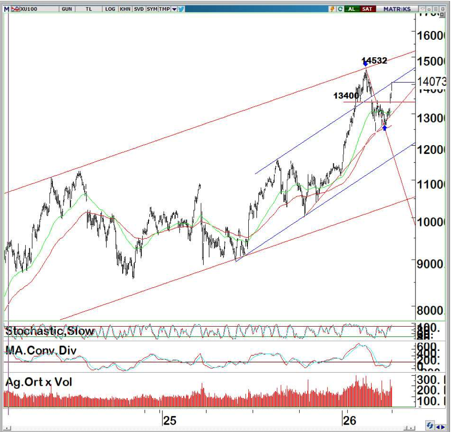 Daha önce direnç olarak çalışan bu seviyeyi artık destek konumunda değerlendirirken, 14.000 üzerindeki fiyatlamalarda ilk etapta 14.190, sonrasında ise tarihi zirve olan 14.532 seviyelerini hedefliyor.