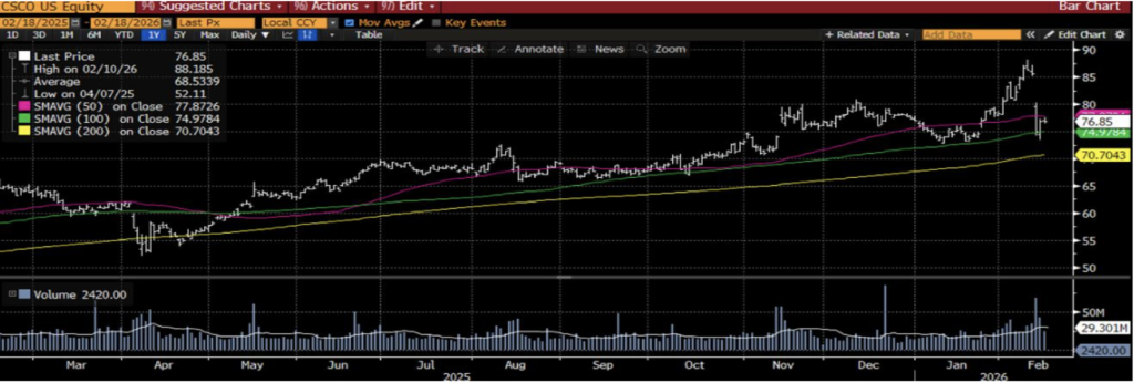 CSCO, 1984 yılında kurulmuş olup ağ donanımı, siber güvenlik ve kurumsal yazılım çözümleri alanında faaliyet gösteren küresel bir teknoloji şirketidir. Şirket, yönlendirici, anahtarlama sistemleri ve bulut tabanlı ağ çözümleriyle kurumsal müşterilere uçtan uca altyapı hizmetleri sunmaktadır.
