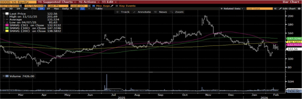 DDOG, bulut tabanlı uygulamalar için izleme ve analiz çözümleri sunan bir yazılım şirketidir. Şirket; altyapı, uygulama performansı, log yönetimi ve güvenlik alanlarında gerçek zamanlı veri takibi sağlayarak kurumların BT operasyonlarını merkezi bir platform üzerinden yönetmesine imkân tanımaktadır.