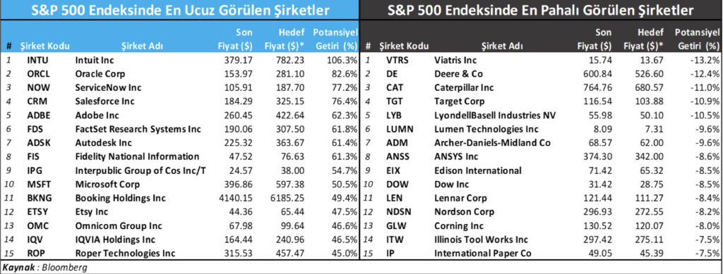S&P 500’de en Ucuz ve en Pahalı Şirketler – Kaynak: Bloomberg