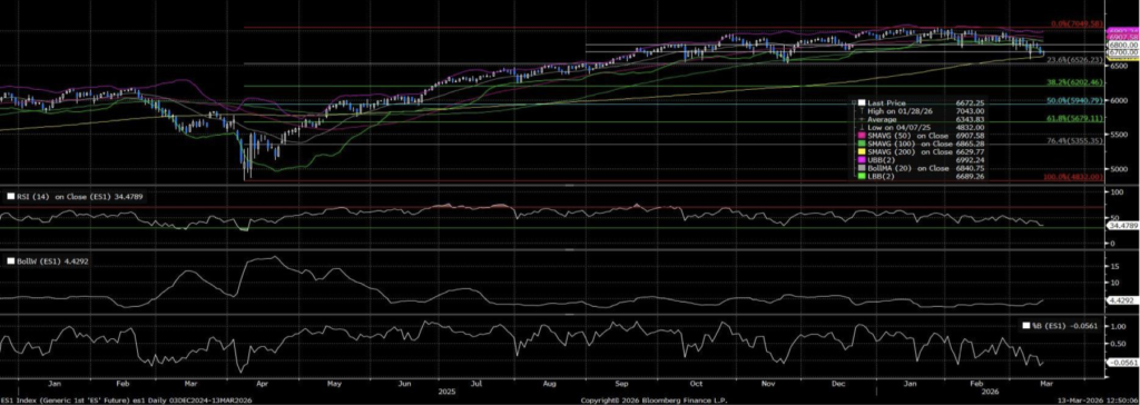 Teknik olarak S&P500 son dönemde 7.000 seviyesine yakın zirveden geri çekilerek 6.670 civarına düşmüş ve kısa vadede momentum kaybı gösteriyor. RSI’nın 35 seviyesine gerilemesi satış baskısının arttığını ve piyasanın zayıf seyrettiğini gösteriyor. Aşağıda 6.526 seviyesi ilk önemli destek, bu seviyenin kırılması halinde 6.240 bölgesine doğru geri çekilme görülebilir; yukarıda ise 6.800-6.900 bandı endeksin yeniden güç kazanması için aşması gereken direnç alanı olarak öne çıkıyor. Teknik seviyeler olarak;