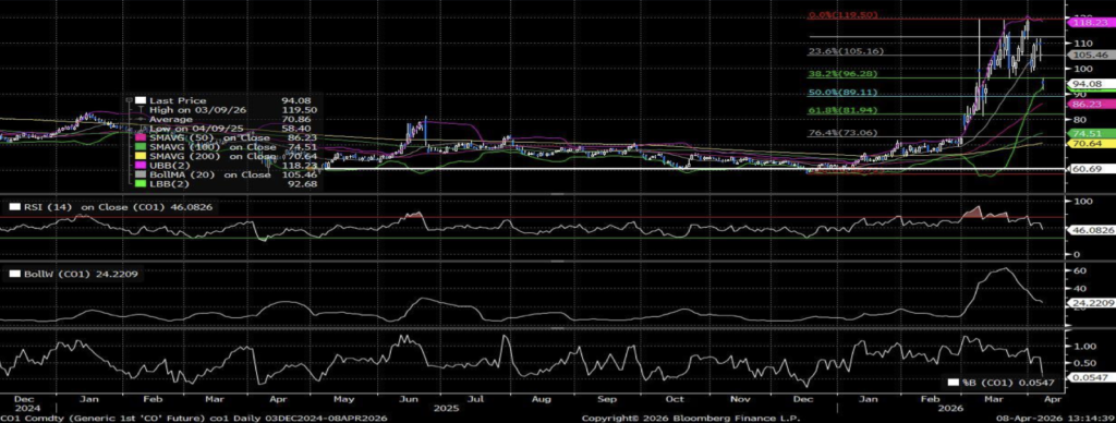 Teknik olarak petrol sert yükseliş sonrası geri çekilerek şu an 94 dolar civarında ve 96–100 bandının altına sarkarak kısa vadede zayıflama sinyali veriyor. RSI’ın 50 altına inmesi ve momentumun düşmesi, aşağı yönlü baskının devam edebileceğine işaret ediyor. 89–86 bölgesi güçlü destek olarak izlenirken, yeniden güç kazanması için fiyatın tekrar 100 üzeri kalıcılık sağlaması gerekiyor.Teknik seviyeler olarak;