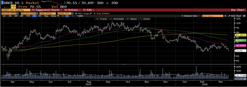 Uber, mobilite ve teslimat odaklı dijital bir platform şirketidir. Şirket; yolculuk paylaşımı, yemek teslimatı ve yük taşımacılığı hizmetlerini uygulaması üzerinden kullanıcılarla hizmet sağlayıcıları buluştururken, aynı zamanda otonom sürüş ve yeni nesil ulaşım çözümlerine yönelik iş birlikleri de geliştirmektedir. Hisse için Bloomberg’de yer alan analist beklentileri 12 aylık vadede ortalama 104.70 USD hedef fiyata ve son kapanış fiyatına göre %48,4 getiri potansiyeline işaret ediyor.