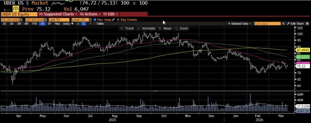 Uber, mobilite ve teslimat odaklı dijital bir platform şirketidir. Şirket; yolculuk paylaşımı, yemek teslimatı ve yük taşımacılığı hizmetlerini uygulaması üzerinden kullanıcılarla hizmet sağlayıcıları buluştururken, aynı zamanda otonom sürüş ve yeni nesil ulaşım çözümlerine yönelik iş birlikleri de geliştirmektedir. Hisse için Bloomberg’de yer alan analist beklentileri 12 aylık vadede ortalama 105.02 USD hedef fiyata ve son kapanış fiyatına göre %39,8 getiri potansiyeline işaret ediyor.