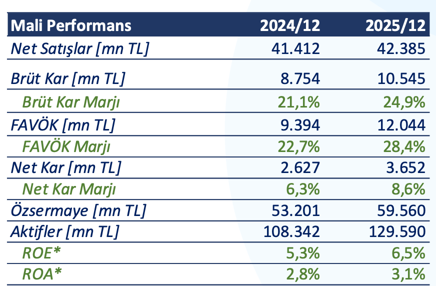 Finansal olarak 2025’te hasılat 42,39 milyar TL, FAVÖK 13,52 milyar TL ve net kâr 4,35 milyar TL seviyesine ulaşırken kârlılık marjlarında iyileşme görülmüştür. FAVÖK’ün büyük kısmı yurt dışı operasyonlardan sağlanmaktadır.