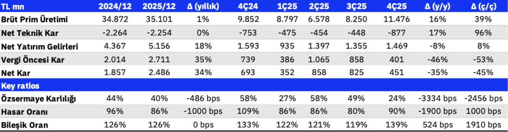 2025 Genel Bakış: Şirket 2025 yılında yıllık %34 net kâr artışı ile 2.486 milyon TL net kâr açıklarken, brüt yazılan prim üretimi yalnızca %1 artmıştır. Bu sınırlı büyüme, şirketin son yıllarda sürdürdüğü “kârlılık odaklı dönüşüm” stratejisinin yansımasıdır. Sektör genelinde motor segmenti, regülasyonlar ve fiyat tavanlarının etkisiyle teknik zarar üretmeye devam etmekte olup bileşik oran %127 seviyesindedir. Buna karşılık motor dışı branşlar, daha etkin fiyatlama kabiliyeti ve görece düşük hasar oynaklığıyla %91’lik bileşik oran ile teknik kârlılığı desteklemektedir.
