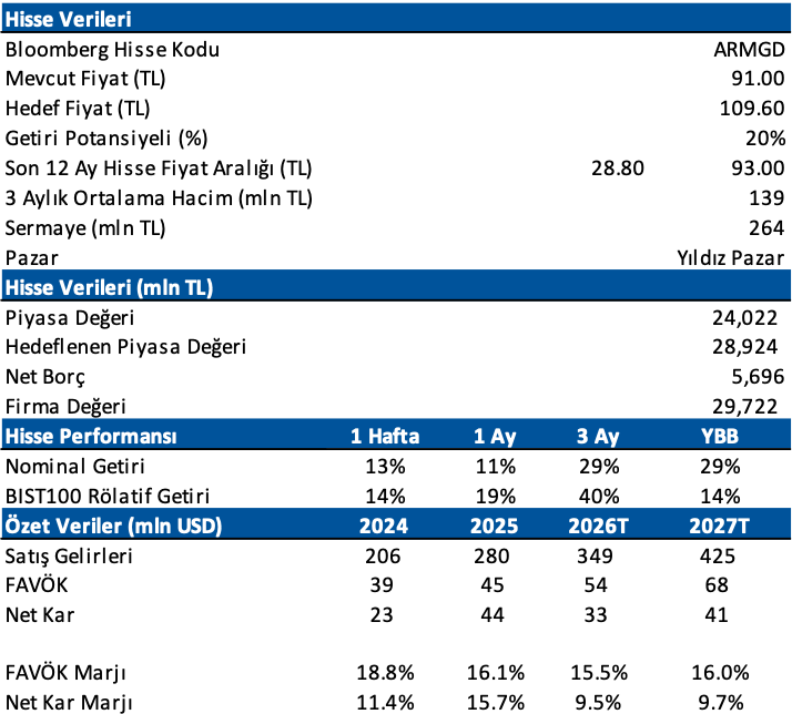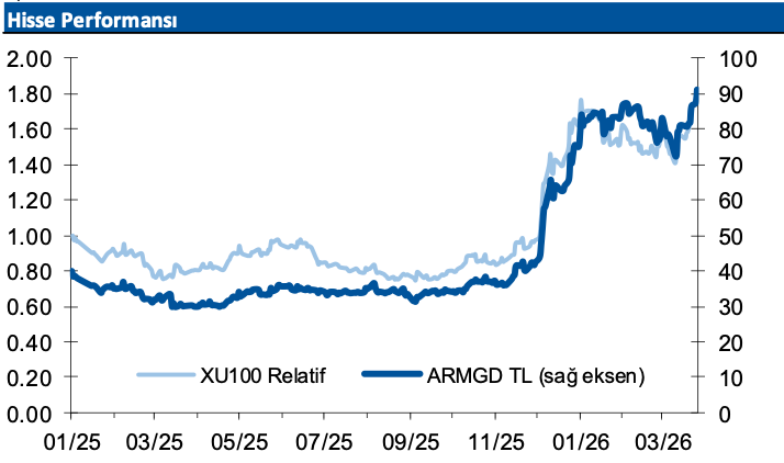 Deniz Yatırım ARMGD için hedef fiyatını 55 TL’den 109.6 TL’ye yükseltti, tavsiyesini TUT olarak korudu.