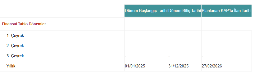 “Şirketimizin 01.01.2025 – 31.12.2025 hesap dönemine ilişkin finansal tablolarının 27 Şubat 2026 tarihinde KAP duyurusu ile kamuya açıklanması planlanmaktadır.”