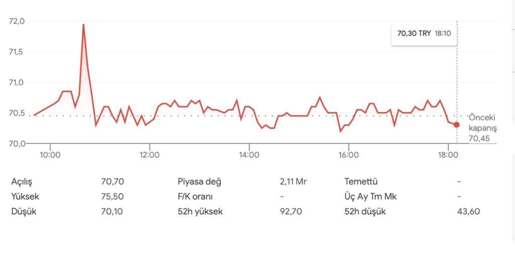 DGATE hissesi son 1 senede %22,26 değer kazanımı elde etti. Son 6 ayda ise hisse %11,74 değer kaybetti. Yılbaşından beri sadece %0,07 değerlenen DGATE, son 1 ayda %0,92 değer kaybetti. Son 5 günde de %4,03 değer kaybeden hisseye yeni Apple distribütörlüğü de yaramadı. Bugün Apple ile distribütörlük açıklaması yapan hisse, %0,21 değer kaybetti. 70,65 TL’den yeni işlem gününe başlayan hisse, seansı 70,30 TL’den noktaladı.
