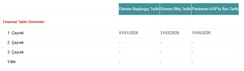 Şirketimizin 01.01.2026 – 31.03.2026 ara hesap dönemine ilişkin finansal raporlarının 11 Mayıs 2026 tarihinde kamuya açıklanması planlanmaktadır.