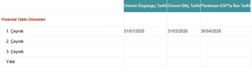 Şirket ilgili bildirimde, 2026 yılının ilk çeyreğine ait finansal sonuçlarını 30 Nisan 2026 tarihinde açıklayacağını duyurdu.