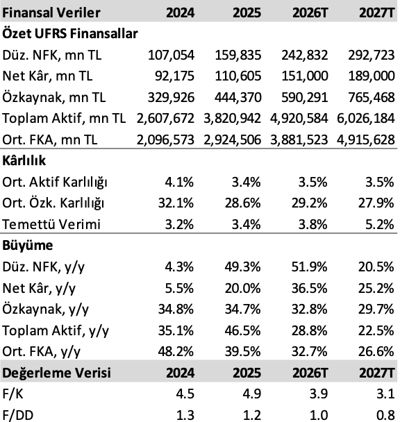Ak Yatırım faizde istikrarlı düşüş ile öz kaynak getirilerinin 2026’da enflasyonu geçmesini ve yüksek yirmili seviyelerde birbirine yakınsamasını bekliyordu. Bu yıl araştırma kapsamındaki benzer bankalar için ortalama 160 baz puan net faiz marjı öngörürken, Garanti için 90 baz puan genişleme öngörmüştü. Ancak Kurum, faizlerin dirençli kalacağı bir senaryoda net faiz marjı değişimlerinin yakınsayacağını ve Garanti Bankası’nın öz kaynak getirisinde diğer bankaların belirgin üzerinde kalmaya devam edeceğini düşünüyor.