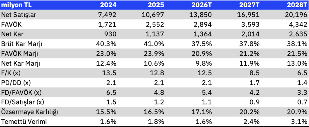 Güçlü bilanço hem organik hem inorganik büyümeyi desteklerken, geçmişte yapılan satın almalar ve devam eden kapasite yatırımları büyüme potansiyelini artırmaktadır. 2026 için şirket büyüme öngörse de daha temkinli beklentilerle gelirlerin yatay kalacağı ve FAVÖK marjının yaklaşık %20,9 seviyesinde olacağı tahmin edilmektedir.