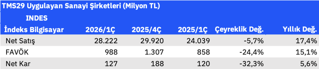 İndeks Bilgisayar’ın 1Ç26 döneminde net satışlarının 28.222 mn TL seviyesinde gerçekleşmesini ve yıllık bazda %17,4 artış kaydetmesini bekliyor. FAVÖK’ün yıllık bazda %17,4 artışla 1.008 mn TL seviyesine ulaşmasını beklerken, FAVÖK marjının yıllık bazda yatay seyrederek %3,6 seviyesinde gerçekleşeceğini tahmin ediyor.