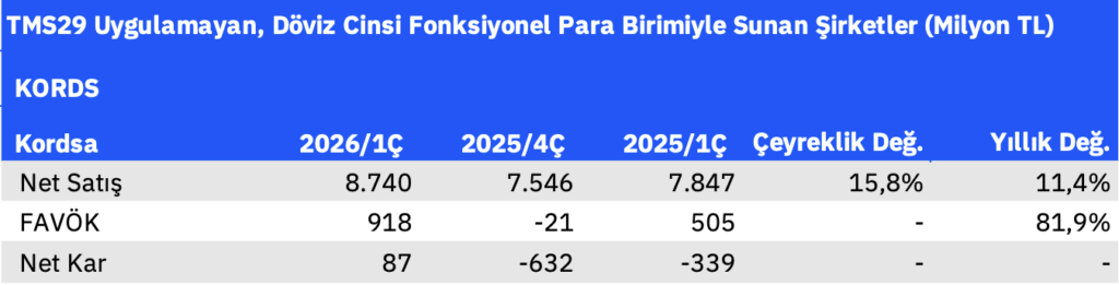 Kordsa için ilk çeyrekte 21mn dolar FAVÖK ve 2mn dolar net kar beklenirken, buna geçen seneki sel felaketinden etkilenen Endonezya faaliyetleriyle ilgili 5mn dolarlık tek seferlik sigorta gelirlerinin katkı vereceği belirtiliyor. Geçen yılın ilk çeyreğinde Kordsa’nın 14mn dolar FAVÖK ve 9mn dolar net zarar açıkladığı hatırlatılıyor. Şirket için 2026/1Ç öngörüsü net satışlarda 8.740 milyon TL, FAVÖK’te 918 milyon TL ve net kârda 87 milyon TL seviyesinde veriliyor.
