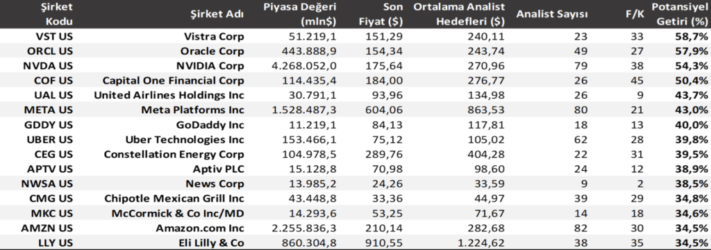 Güncel değerleme / analiz raporları yayımlanan ve bu raporlarda “alım” önerileri ile dikkat çeken S&P 500 şirketlerini aşağıda görebilirsiniz. Tablodaki veriler, Bloomberg’de paylaşılan güncel analist beklentilerini yansıtmaktadır.