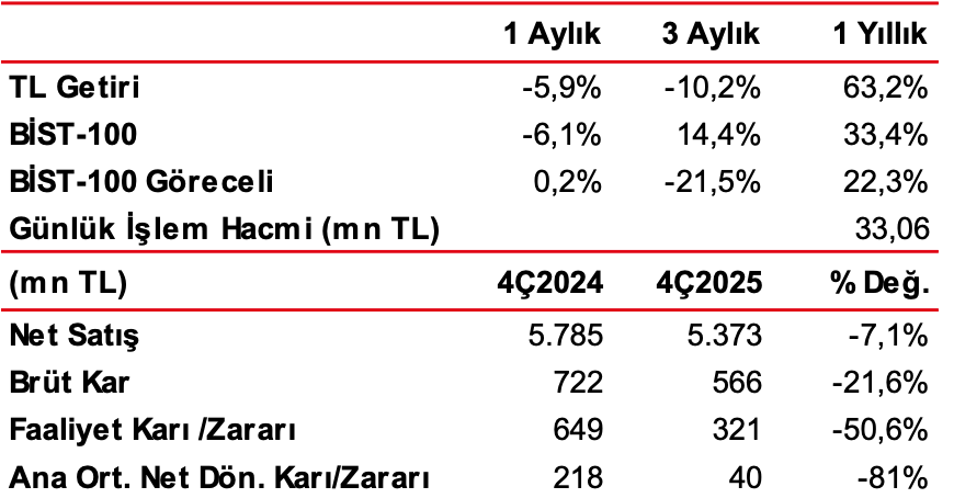 2026 yılı için ciro büyümesi %25-30, FAVÖK marjı %10-12, net kar marjı %3-4 ve yatırım/ciro oranı %7-8 olarak öngörülmektedir. Şirket, 92mn TL’lik geri alım programını tamamlamış olup, yeni program değerlendirilmektedir. 2027 yılında Samsun Fabrikası’nın devreye alınmasıyla, yıllık üretim kapasitesinin 1.741.000 tona, saatlik üretim kapasitesinin ise 320 tona yükselmesi hedeflenmektedir.