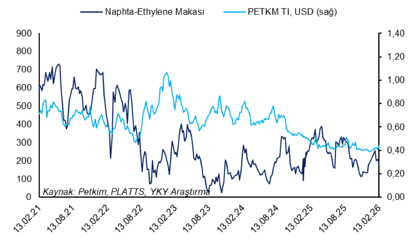 YKY Görüş: “Makas, Petkim açısından doğrudan karlılık ölçütü olmasa da belli oranda öncü gösterge niteliğindedir. Nafta-Etilen makasında 11 kat artışa işaret eden haftalık verileri PETKM için POZİTİF olarak değerlendiriyoruz. Şirketle yaptığımız görüşme ve araştırmalarımız Çin’den ve Ortadoğu’dan Avrupa’ya tedarik sıkıntılarının başladığını ve bu durumun fiyatlara yansımaya başladığını gösteriyor.