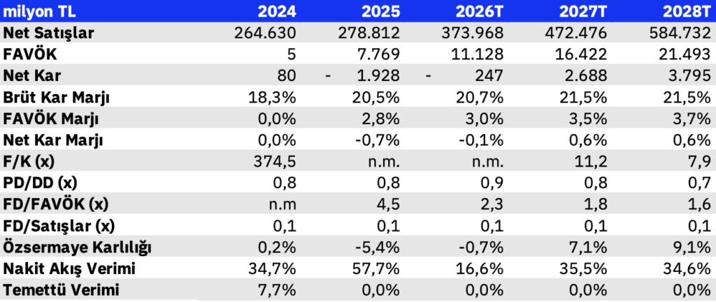Şirket Beklentileri: Şirket, 2026 yılı için reel bazda %5 (+/- %1,0) ciro büyümesi, %3,0 (+/- %0,5) FAVÖK marjı ve cironun yaklaşık %2,0’si seviyesinde (2025 ile paralel) yatırım harcaması öngörmektedir.