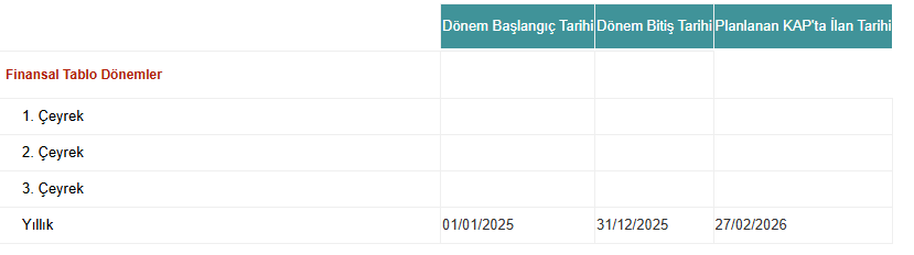 “Şirketimizin 01.01.2025 – 31.12.2025 hesap dönemine ilişkin finansal tablolarının 27 Şubat 2026 tarihinde KAP duyurusu ile kamuya açıklanması planlanmaktadır.”