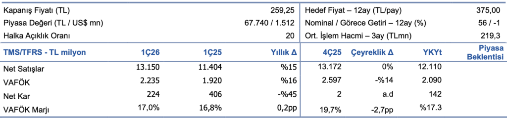 Şirket 1Ç26’da 13.150 milyon TL net satış, 2.235 milyon TL VAFÖK ve 224 milyon TL net kâr açıkladı. Net satışlar yıllık %15, VAFÖK yıllık %16 arttı ve VAFÖK marjı %17,0 oldu. Net kâr yıllık %45 gerilerken, vergi öncesi kâr yıllık %3 arttı. Raporda, geçen yılki tek seferlik vergi gelirleri ve IAS29 endekslemesine bağlı ertelenmiş vergi giderlerinin bu ayrışmayı yarattığı ifade edildi.