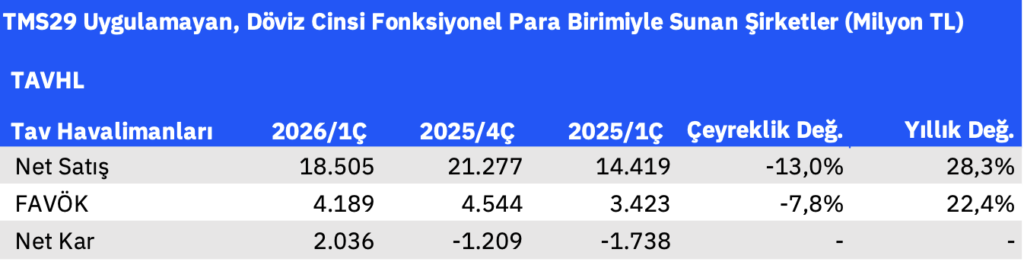 Tav Havalimanları’nda 1Ç26 için net satışların 18.505 mn TL, FAVÖK’ün 4.189 mn TL ve net kârın 2.036 mn TL olması bekleniyor. Şirketin 2026 tahminlerine göre 5.4x FD/FAVÖK ve 14.5x F/K çarpanlarıyla işlem gördüğü belirtiliyor. Geçen yılki tek seferlik inşaat gelirlerinin bu yıl tekrarlanmaması nedeniyle diğer gelirlerde düşüş beklenirken, Kazak hükümetinin jet yakıtını düşük fiyatla satmasının Almaty’de yakıt satışları üzerinden FAVÖK’e baskı yaratacağı ifade ediliyor. Buna karşın düşük sezon nedeniyle bu baskının sınırlı negatif kalacağı değerlendiriliyor.