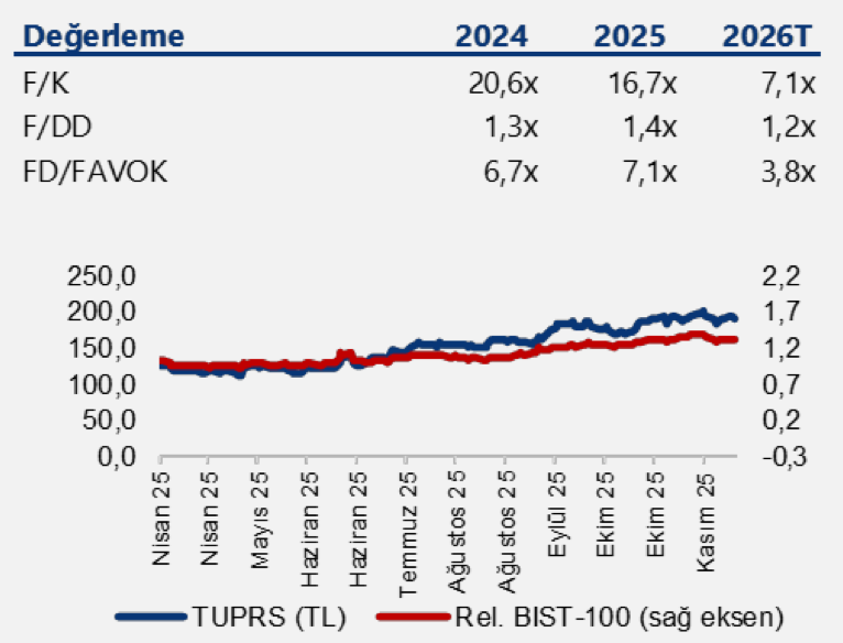 Hedef fiyata İndirgenmiş Nakit Akımları (İNA) yöntemiyle ulaşılmıştır. Revize modelde 2026 yılı ortalama Brent varsayımı 87,5 USD/varil, net rafineri marjı varsayımı 11,10 USD/varil olarak belirlenmiştir. Crack varsayımlarında efektif dizel marjı 34, jet yakıtı 43, benzin 17 USD/varil olarak alınmıştır. USDTRY tarafında 48,50 ortalama kur varsayımı kullanılmaktadır.