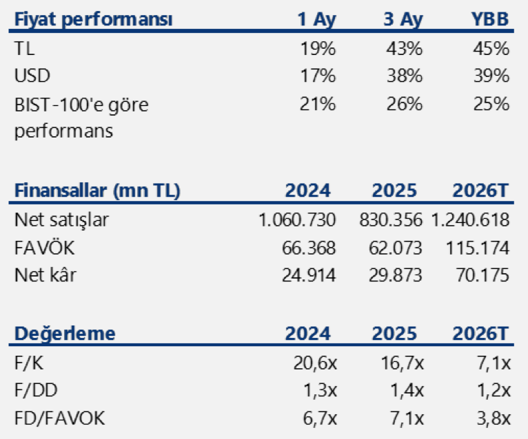 Analist, Tüpraş için 12 aylık hedef fiyatı 271,00 TL’den 352,00 TL’ye yükseltmiş ve AL tavsiyesini korumuştur. Revizyonun ana nedeni, orta distilat marjlarındaki (dizel, jet yakıtı) güçlenmenin net rafineri marjı görünümünü iyileştirmesidir. Bu doğrultuda 2026 FAVÖK tahmini %61 yukarı revize edilmiştir. Güncellenen tahminlerle hisse 2026T’de 7,1x F/K ve 3,8x FD/FAVÖK ile işlem görmektedir ve mevcut fiyattan %38 getiri potansiyeli sunmaktadır.