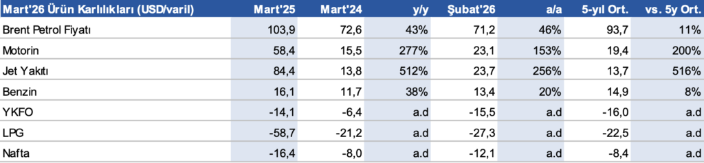 Mart ayında Brent petrol 75-114 USD/varil aralığında dalgalandı ve ortalama 103,9 USD/v oldu. İran-İsrail-ABD arası çatışmalar hem petrol fiyatlarında hem orta distilat ürün marjlarında sert yükselişe neden oldu. Mart ayında orta distilat Ürün marjları 2022 Rusya-Ukrayna savaşı sırasında kaydedilen seviyelerin bile üzerinde seyretti.