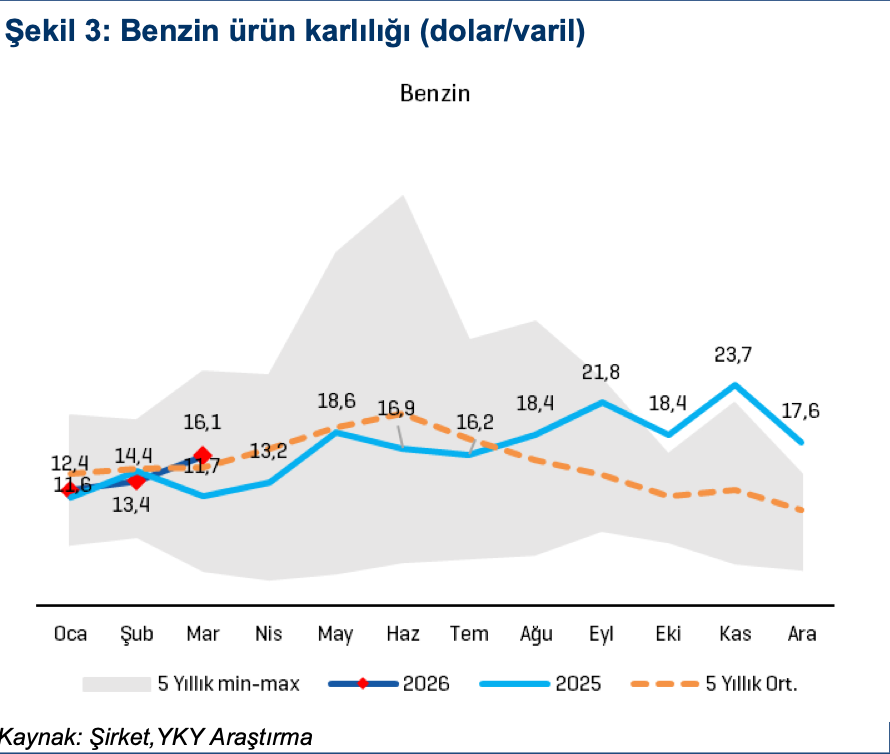 Yapı Kredi Yatırım Görüş: “Ortadoğu’da yükselen gerginlik petrol ve rafine ürün marjlarını destekliyor. Bölgede faaliyet gösteren rafinerilerin ağırlıklı orta distilat olması orta distilat ürün marjlarının tarihi yüksek seviyelere yükselmesini sağladı. Bölgede gerginliğin ürün marjlarını desteklemeyi sürdüreceğini düşünüyoruz. Savaş sona erse bile hasar gören rafinerilerin açılması zaman alacağından kısa sürede normalleşme beklemiyoruz. Ayrıca yüksek sezona da giriyor oluşumuzun marjlarda aşağı yönlü riskleri sınırlayacağını düşünüyoruz ve ürün marjlarının önümüzdeki çeyreklerde güçlü kalmasını bekliyoruz. Diğer taraftan Rusya, dron saldırıları nedeniyle 1 Nisan’dan itibaren benzin ihracatını tekrar yasaklayacağını duyurdu. Bu gelişmenin de bölgedeki benzin marjlarını destekleyeceğini düşünüyoruz.”