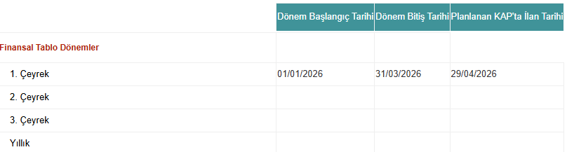 Şirketimizin 01.01.2026 – 31.03.2026 hesap dönemine ilişkin finansal raporlarının 29 Nisan 2026 tarihinde kamuya açıklanması planlanmaktadır.