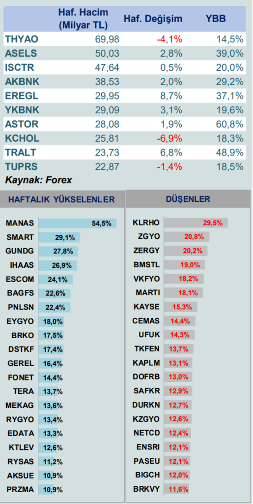 Yılbaşından itibaren bakıldığında ise ASTOR %60,8 ile en yüksek getiriyi sağlayan hisse oldu. TRALT %48,9, ASELS %39,0 ve EREGL %37,1 oranında yıllık artış gösterdi. KCHOL ve TUPRS gibi bazı büyük ölçekli şirketler ise haftalık bazda negatif değişim kaydetti.